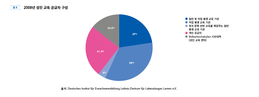 직업 교육과 훈련을 위한 연방 기구 BIBB 통계(2008)에 따르면 위에 명시된 정부·비정부 기관들로부터 지원을 받아 현재 약 25,000개 기관에서 성인 교육 프로그램을 운영하고 있다.