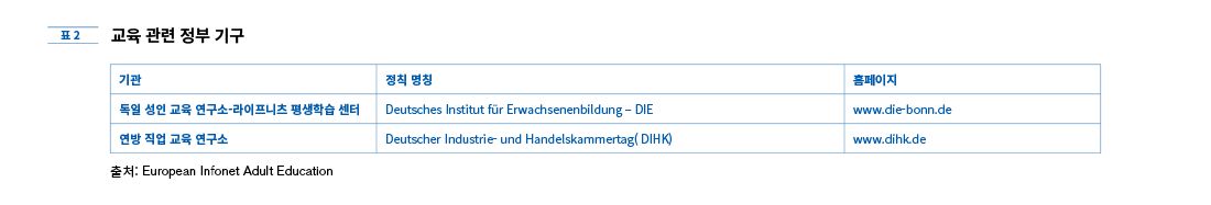 독일의 교육은 '평생교육(Lenbenslanges Lernen)''계속교육(Weiterbildung)'의 틀 안에서 모든 국민이 다양한 교육 기회를 누리게 하는 것을 목표로 한다. 독일 성인 교육 학자 Peter Brandt는 일반적 분류법에 적용하자면 독일 교육은 특정'체계(system)'보다'영역(field)'의 개념에서 이해되어야 하며 독일 성인 교육은 이러한 분류에 의해 크게'일반 성인 교육''직업 성인 교육'으로 분류된다고 설명한다(Brandt. 2015). 두 분야 모두 교육 현장에서 정규, 비정규 또는 비형식 교육의 형태로 이루어진다.