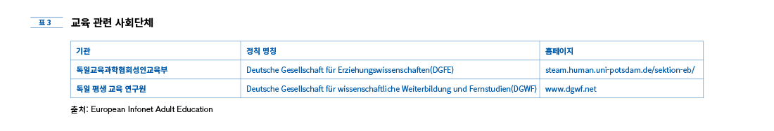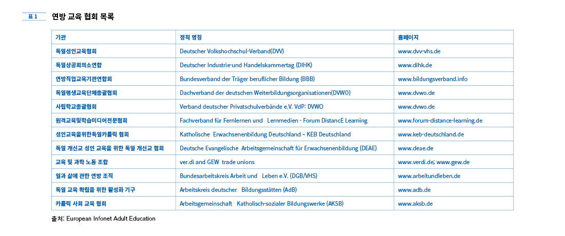 독일은 기초 교육에만 정부차원의 공적 지원이 이루어지고 있기 때문에 계속 교육 형태의 성인 교육은 연방 교육 정책으로부터 최소한의 규제만 받으며 성인 교육 틀 안의 모든 교육은 관련 협회와 국가 교육 기구 또는 교육 관련 사회단체 등으로부터 지원을 받는다. 독일 성인 교육에 있어 가장 중요한 역할을 하는 연방 교육 협회와 국가 교육 기관, 교육 관련 사회단체는 다음과 같다.
