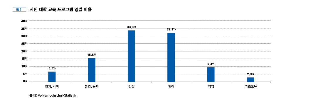 전체 학생 중 50+ 세대는 건강 관련 수업을 32.6%의 가장 높은 비율로 수강했고, 그 다음을 문화, 디자인(30%), 직업(26.8%), 정치, 사회, 환경(23.6%), 언어(21.2%), 기초 교육 (7.1%)의 순으로 수강했다. 또한 의무 교육 체계에서 다루는 교육 내용을 평생 교육 차원에서 제공하는 기초 교육에서 50+ 세대와 65세 이상 연령대의 낮은 수강률을 보이는 것으로 미루어 보아 높아진 50+ 세대의 기초 교육 수준을 짐작할 수 있다.