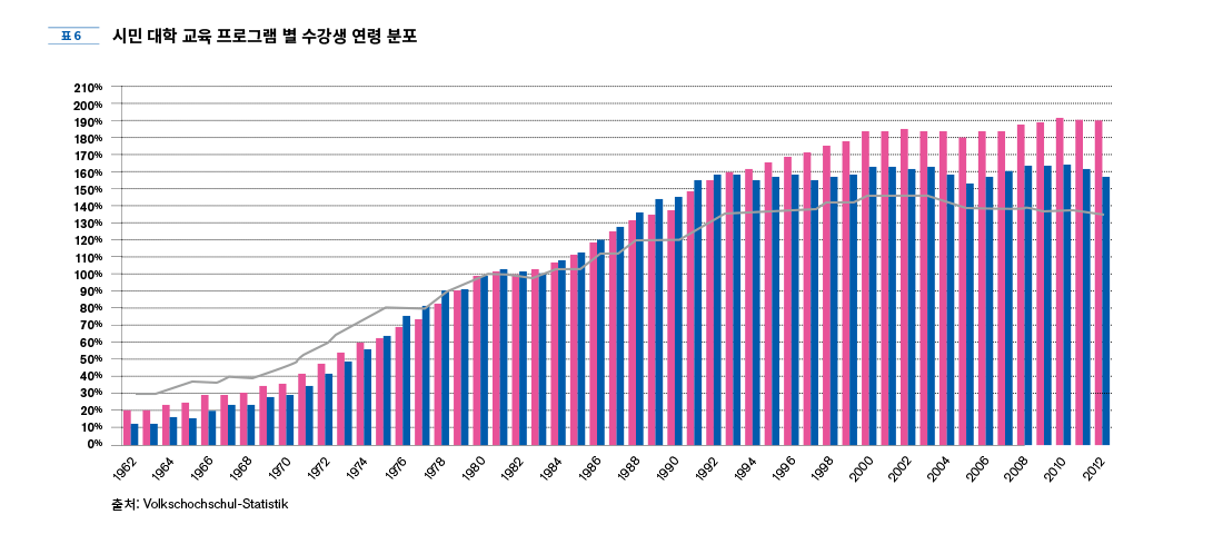 앞서 본 바와 같이 독일 전체의 시민 대학 수강생의 절반 가까이를 50세 이상의 성인 인구가 차지하고 있다. 점점 장년 이상의 성인 수강생이 늘어나는 추세는 지속적으로 배우지 않으면 따라 갈 수 없을 정도로 빠르게 진행되는 정보화와 산업 구조의 변화와 더불어 이루어진 지식과 정보의 폭발적 증가로 인하여 이전에 받은 교육 정도와 상관없이 배움을 이어나가야만 사회 생활에 적응해 나갈 수 있는 현대 사회의 특징이 반영된 것일 것이다. 특히 늘어난 여가 시간과 생활의 안정을 기반으로 생애에 걸친 배움의 기회를 누리고자 하는 요구가 과거의 어느 시대보다 높다고 할 수 있다. 더 이상 교육을 받지 않아도 될 것 같이 여겨지던 성인 세대조차 새로운 지식에 대한 계속되는 학습을 요구받고 있다. 그런 의미에서 연령에 구애 받지 않고 누구에게나 열린 교육을 실천하는 시민대학이 독일 사회 속에서 가지는 의의는 매우 크다.
