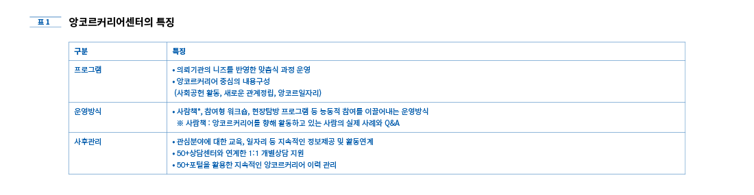 서울시50플러스재단 앙코르커리어센터는 '퇴직(예정)자의 앙코르커리어 전환교육' 프로그램 운영을 통해 50+세대의 퇴직 후 인생재설계를 지원하고 있다. 기존의 전직지원서비스가 생계형, 일 중심이었다면 센터의 교육은 개인의 삶과 사회적 가치 전반에 초점이 맞추어져 있다. 자신의 역량과 경험을 사회적 경제, 사회공헌 분야 등에 활용하여 일과 삶이 조화를 이룰 수 있도록 체계적이고 지속적인 서비스를 지원하는 곳이 앙코르커리어센터다. 특히 ① 현장(의뢰기관 및 교육 참여자)의 니즈를 반영한 맞춤형 콘텐츠, ② 사람책과 참여형 실습형 과정 등 능동적인 참여를 유도하는 교육 운영방식, 50+캠퍼스의 상담과 교육, 커뮤니티 및 50+인재풀과 연계한 지속적인 사후관리는 타 기관 전직교육 프로그램과의 차별성을 더하고 있다.