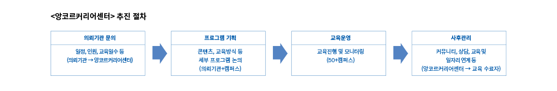 앙코르커리어 전환교육에 참여하기 위해서는 의뢰기관 퇴직(예정)자들의 니즈(needs)를 조사하고, 참여인원 및 시기를 정하여 앙코르커리어센터로 문의하면 된다. 문의가 오면 앙코르커리어센터는 해당기관의 요구를 가장 적합한 50+캠퍼스를 매칭 하여 전체 프로그램의 기획회의를 진행한다. 의뢰기관, 앙코르커리어센터, 50+캠퍼스의 교육 담당자가 수요자의 요구에 가장 적합한 프로그램(콘텐츠, 교육 방법, 일정 등)을 설계하고, 교육 후에는 의뢰 기관과의 간담회를 통해 만족도 조사결과, 교육 참여자 의견을 공유하여 다음 번 교육에 반영한다. 교육운영 후에는 퇴직 연차별, 참여자의 관심 분야 등에 맞춰 커뮤니티 지원, 상담지원, 교육 및 일자리 정보제공과 같은 사후관리가 진행된다.