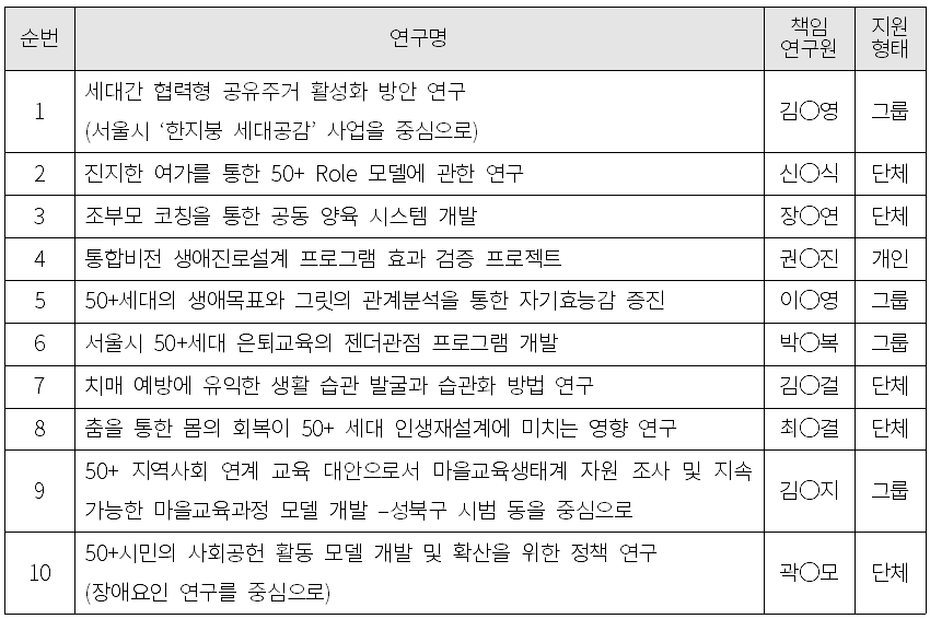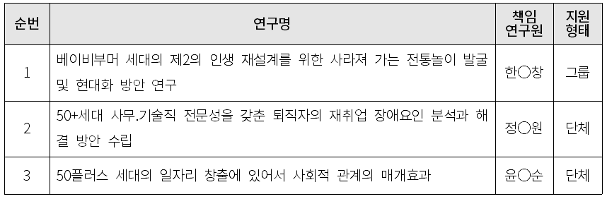 50+당사자연구 2차 심사에 따른 결과를 아래와 같이 공고하오니 결과를 확인해주시기 바랍니다.