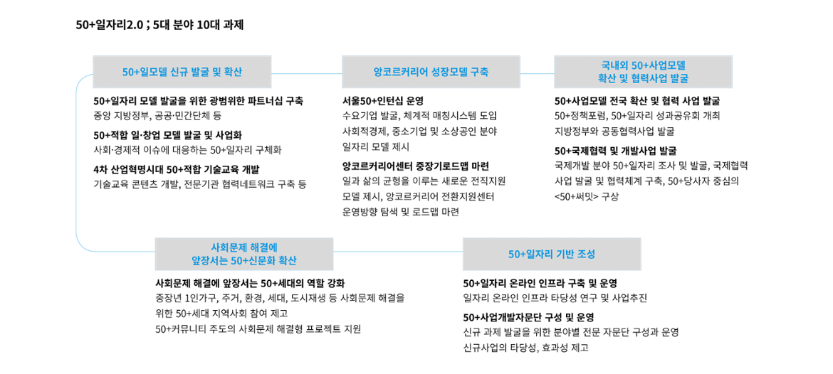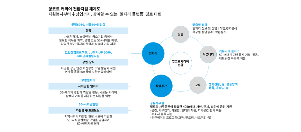 50+세대의 인생후반기 적정소득과 자아실현, 사회적 목적의 균형을 이루는 ‘앙코르커리어’로의 전환은 50플러스재단 일자리의 정체성이자 비전이기도 하다. 이를 위해서 상담부터 교육, 커뮤니티, 일자리까지 서로 유기적 관계와 선순환 구조가 중요하다. 특히, 올해부터 50플러스 세대들의 자원활동부터 사회공헌형 일자리, 재취업과 창업에 이르기까지 ‘앙코르