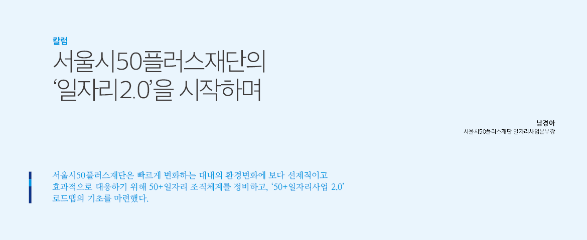 단언컨대, 시대를 초월하여 ‘일자리’는 언제든 화두였다. 역대 모든 정권에서 ‘일자리 정부’의 기치를 내세웠지만 속시원하게 해결한 적이 있었던가. 이번 정부에서도 출범하자마자 「신중년 인생3모작 기반구축 계획」을 포함한 「일자리 정책5년 로드맵」을 수립하고 100개의 세부 추진과제를 발표하는 등 ‘일자리정부’로서의 의지를 표명했지만, 아직까지 그 실적에 대한 여러 의견이 있다. ‘일자리’ 그만큼 어렵고 또 어려운 문제다. 인류가 맞이하는 첫 번째 노년층이라고 하는 50+세대의 체계적 지원을 위해 2016년 설립된 서울시50플러스재단은 ‘일자리’를 최우선 미션으로 설립된 기관은 아니다. 하지만, 전 세계에서 가장 빠른 퇴직을 하고 있는 한국사회 현실에서 50+세대에게 ‘일자리’는 여전히 가장 중요한 이슈다. 그래서 서울시50플러스재단에서는 출범 4년차를 맞아 빠르게 변화하는 대내외 환경변화에 보다 선제적이고 효과적으로 대응하기 위해 50+일자리 조직체계를 정비하고, 각계 전문가와 당사자들의 의견을 수렴하여 ‘50+일자리사업 2.0’의 로드맵의 기초를 마련했다.
