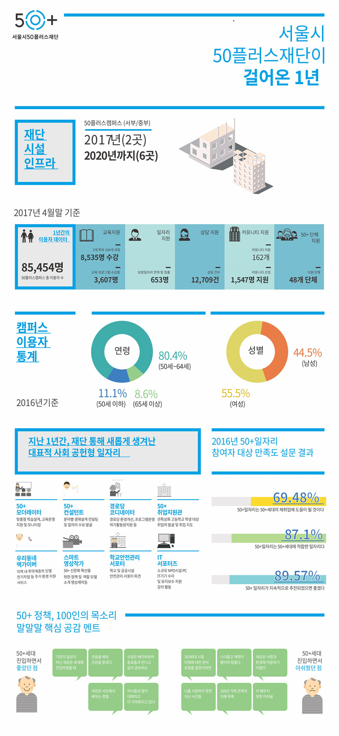 설립 1주년을 맞아 서울시50플러스재단은 재단이 걸어온 1년간의 성과와 발자취를 인포그래픽으로 제작․발표했다.(붙임 참조)