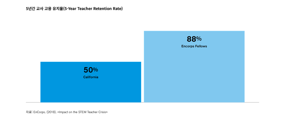 은퇴 후 교사로 변신한 50+세대는 삶의 경험을 토대로 어린 학생들에게 인생의 멘토와 롤모델이 된다. 또한 STEM 분야에서 평균 17년 이상 근무한 EnCorps 참여자들은 학생들에게 수학·과학 지식을 보다 설득력 있게 전달할 수 있다. EnCorps 프로그램이 시작된 2008년부터 2015년까지 약 85명의 전일 교사가 배출되었으며, 매해 80-90명의 프로그램 합격자들이 파트타임 강사나 보조교사로 근무 중이다. 실제로 EnCorps 프로그램은 캘리포니아 지역의 교사 공급과 교육의 질 향상에도 효과적이다. EnCorps 측의 설문 조사에 따르면 해당 프로그램에 ‘참여한 학교(School Partners)들의 96%가 학생들의 수학 및 과학에 대한 관심이 증가했다’고 밝혔다. 또한 첫 5년간 근무 기간을 기준으로 캘리포니아 주 공립학교(주로 저소득 계층이 많은 공립학교)에 근무하는 일반 교사들에 비해 EnCorps 출신 교사들의 고용 유지율(retention)이 약 38%나 더 높았다(EnCorps, 2018).