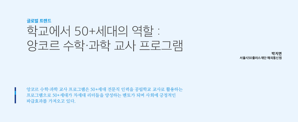 대한민국의 기대수명이 매년 증가하는 현재 상황에서 50+세대의 성공적인 제 2의 커리어 탐색은 우리 사회의 주요 과제일 것이다. 본 원고는 ‘앙코르 수학과학 교사 프로그램(EnCorps STEM Teacher Program)’을 중심으로 미국 50+세대의 학교 내 역할을 탐색할 것이다.