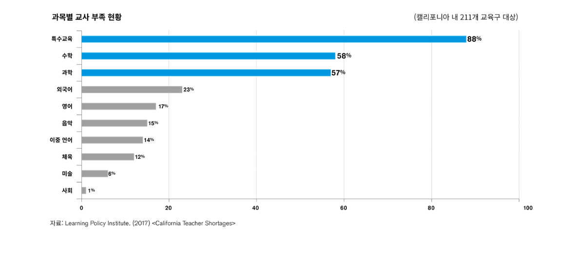 미국 내 교육 관련 정책을 연구하는 싱크탱크인 ‘교육정책연구소(Learning Policy Institute)’가 2017년 캘리포니아 주 학교 위원회 연합(California School Boards Association)에 속한 211개의 교육구(school districts)를 대상으로 한 조사에 따르면, 캘리포니아 주는 심각한 교사 부족 문제로 골머리를 앓고 있다. 해당 교육구 중 75%가 교사 부족 문제를 겪고 있으며, 2013년 이후 교사 부족 문제는 점점 악화되고 있다. 또한 특수교육과 수학·과학 분야 교사 확보에 특히 어려움을 겪고 있다.