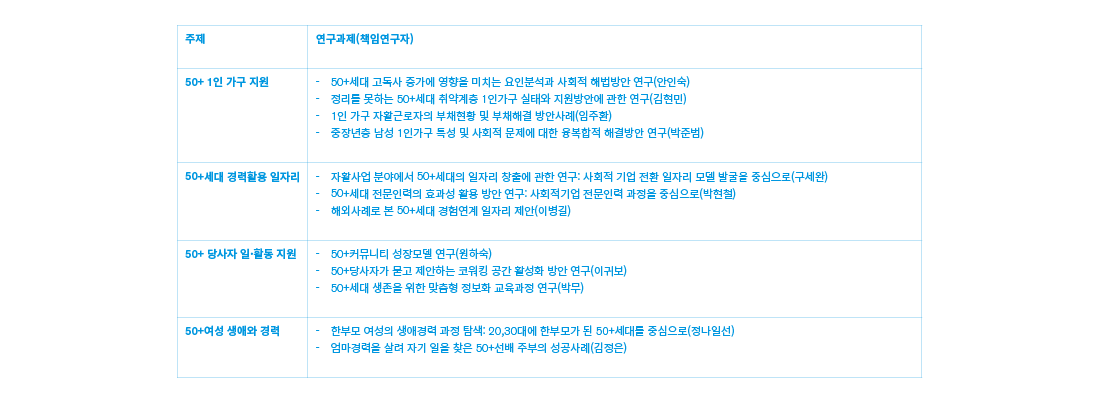 경험과 전문성을 갖춘 50+단체 및 개인 연구자를 지원하여 체감도 높은 이슈 발굴과 구체적 현실에 기반한 정책 제안 등 당사자 주도형 연구사업이다. 50+정책 당사자인 50+세대가 자기 삶의 연구자가 되어보는 경험과 기회를 제공하여 현장에 적용될 수 있는 체감도 높은 정책의제를 발굴하여 정책 실효성 제고한다.