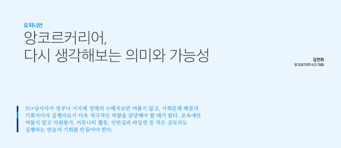 기존과는 다른 관점으로 보고 정책 우선순위를 앞당기기 위한 노력이 필요하지 않을까? 여기에 50+세대의 역할이 있고 앙코르커리어의 의미가 있다.