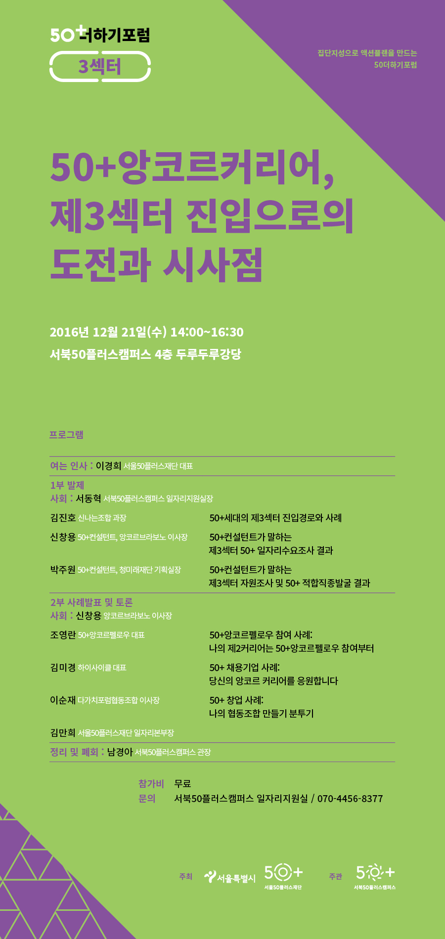 서울특별시 50플러스재단 (우04147)서울시 마포구 백범로31길 21, 1층 사업자등록번호 : 219-82-61209