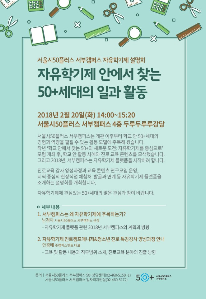 아울러 서울시50플러스재단은 50+세대의 열띤 참여를 위해 오는 20일(화) 오후 2시 서부캠퍼스에서 ‘자유학기제 안에서 찾는 50+세대의 일과 활동’을 주제로 설명회를 연다.
