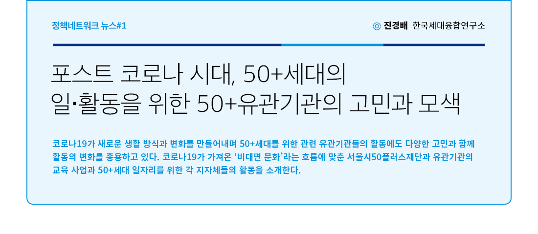 포스트 코로나 시대를 맞아 비대면 문화가 확산되면서 그동안 사람과 지역을 중심으로 활동해 왔던 50+세대들의 일‧활동 및 사회공헌활동이 암초에 부딪치고 있다. 화상회의, 유튜브 활동 등 다양한 비대면 활동을 통해 새로운 활동방식을 찾아 나서고 있지만, 일‧활동 방식 모색에 있어 50+세대들의 고민과 좌절이 깊어간다. 포스트 코로나 이후 정부 및 지자체의 방역방침과 사회적 거리두기에 따라 교육활동, 행사, 시설 운영이 대부분 중단된 서울시50플러스재단을 비롯한 50+유관기관들 또한 아무도 가보지 않은 길 위에서 50+세대들의 일‧활동을 지원하기 위한 대안 모색을 다양하게 시도하고 있다. 포스트 코로나 이후 서울시50플러스재단을 비롯한 50+유관기관들의 50+세대 일‧활동을 지원하기 위한 활동 소식을 담아 본다.