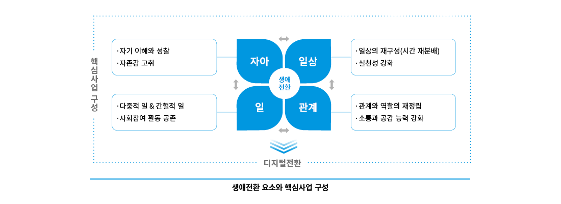 서울시50플러스캠퍼스에서 추구하는 생애전환의 요소는 자아, 관계, 일상, 일-활동으로써 크게 4가지로 이루어져 있다. 또한 코로나19 확산에 따라 디지털 전환의 문제가 부각하면서 ‘디지털 전환을 어떻게 접목할 것인가?’가 또 다른 과제로 떠올랐다. 전환이라는 것은 특정 사건이 아니라 경험을 필요로 하는 과정이기 때문에 누군가의 컨설팅이나 교육 등을 통해 자동적으로 습득되거나 이루어지는 것이 아니다. 그렇기 때문에 캠퍼스에서의 다양한 사업 참여를 통해 당사자 스스로 주도적 전환이 이루어질 수 있도록 경험과 기회를 제공하는 것이 생애전환지원 사업의 목표이다.
