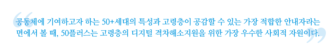 따라서 서울시50플러스재단은 고령층의 디지털격차 해소를 지원하기 위해서 디지털 전환의 50플러스 선도 집단을 발굴하고 양성하는 미션을 가져야 한다.