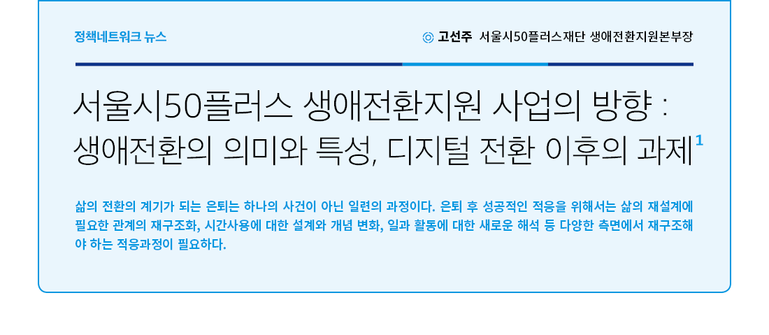 1 고선주, 「2020년 제1회 생애전환지원포럼」 서울시50플러스 생애전환지원사업의 성과와 포스트 코로나 이후의 대응 과제, 2020.9.17.