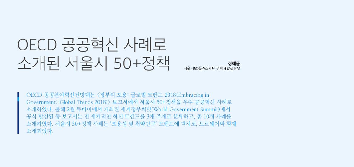 OECD 공공분야혁신전망대는 <정부의 포용: 글로벌 트렌드 2018(Embracing in Government: Global Trends 2018)> 보고서에서 서울시 50+정책을 우수 공공혁신 사례로 소개하였다. 올해 2월 두바이에서 개최된 세계정부써밋(World Government Summit)에서 공식 발간된 동 보고서는 전 세계적인 혁신 트렌드를 3개 주제로 분류하고, 총 10개 사례를 소개하였다. 서울시 50+정책 사례는 ‘포용성 및 취약인구’ 트렌드에 멕시코, 노르웨이와 함께 소개되었다.