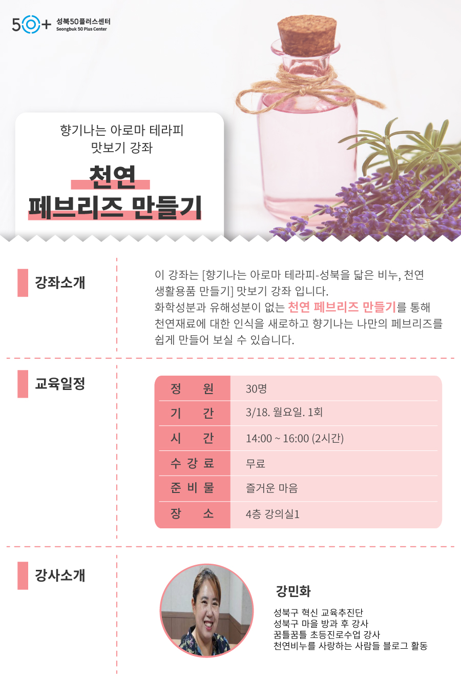 (1 회차) 2019.03.18(14:00 ~ 16:00) 4층 강의실3 강민화 천연 페브리즈 만들기 -