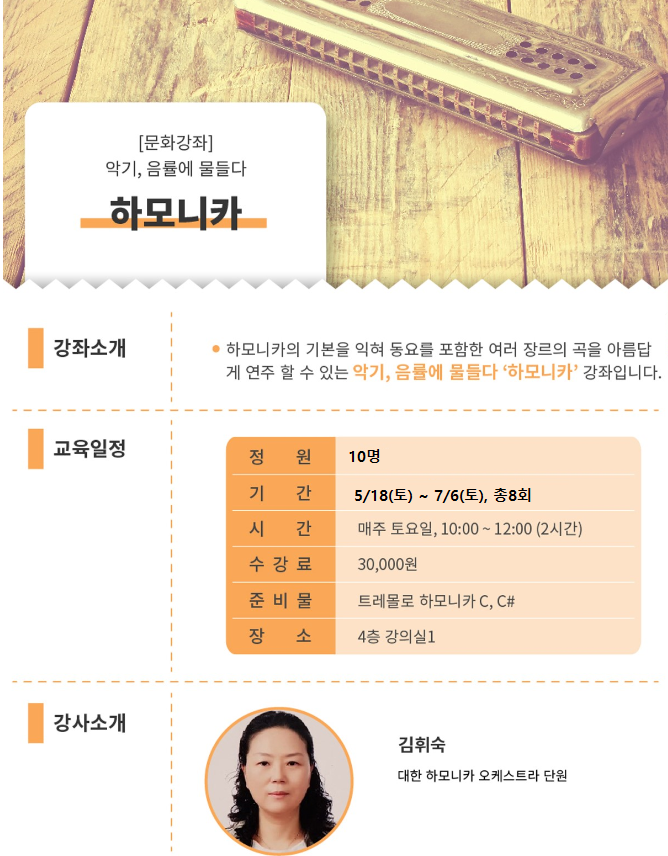 (1 회차) 2019.05.18(10:00 ~ 12:00) 4층 강의실3 김휘숙 하모니카의 역사와 기본기 익히기 : 하모니카 약식악보 보는 법, 음자리 익히기 트레몰로 하모니카 C. C#