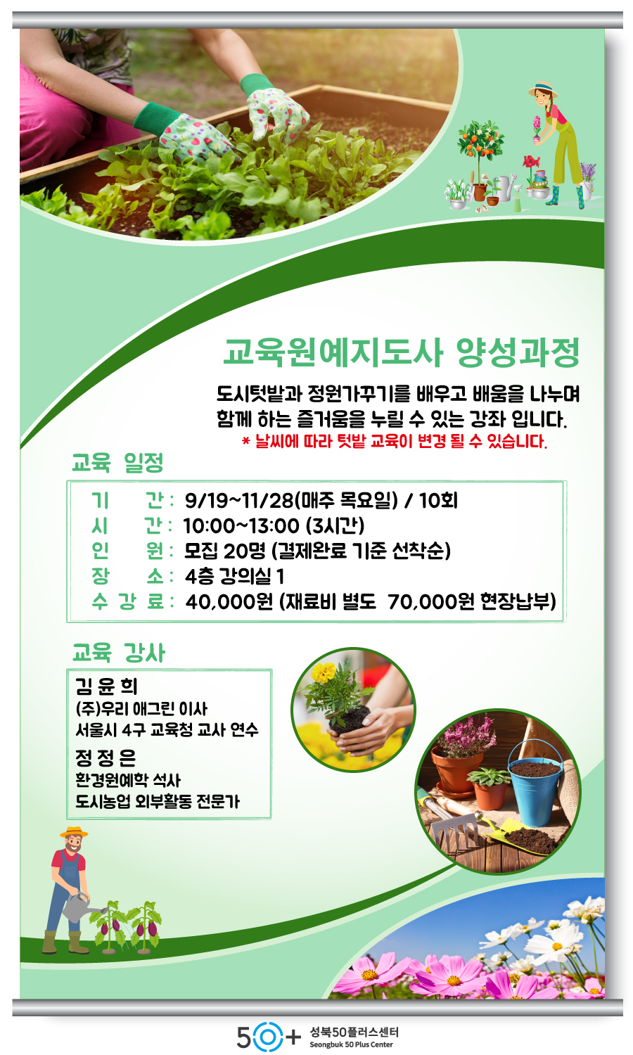 4층 강의실3 | 김윤희 | OT. 만남과 소통 원예 및 교육에 대한 이해 / 텃밭조성 | 재료비 70,000원 현장납부 환불불가 |