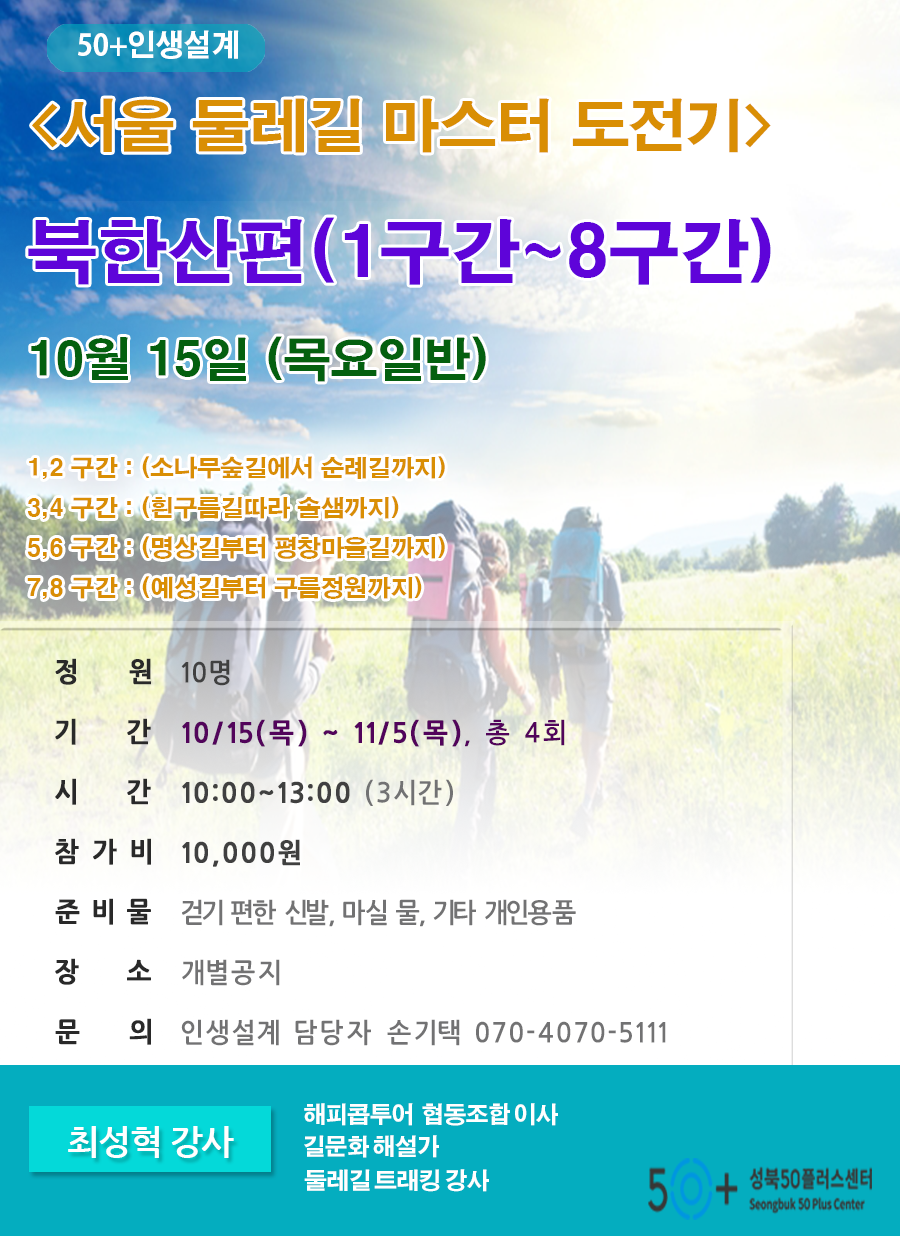 북한산정릉탐방안내 | 최성혁 | 북한산둘레길 5,6구간 (명상길~평창마을길) 만남의 장소 : 북한산 정릉탐방 안내소 앞 오시는 방법 : 4호선 길음역 2,3번 출구 -> 143, 110B 버스 종점하차 |