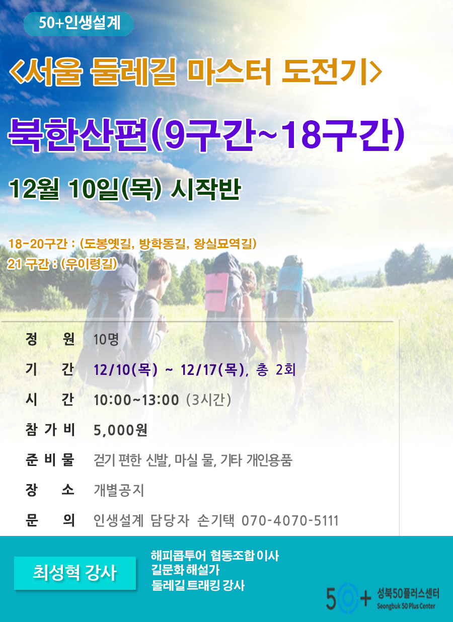 도봉탐방지원센터 | 최성혁 | 북한산둘레길 18,19,20구간(도봉옛길,방학동길,왕실묘역길) 만남의 장소 : 도봉탐방지원센터 오시는 방법 : 1호선/7호선 도봉산역 하차 후 도보 20분 |