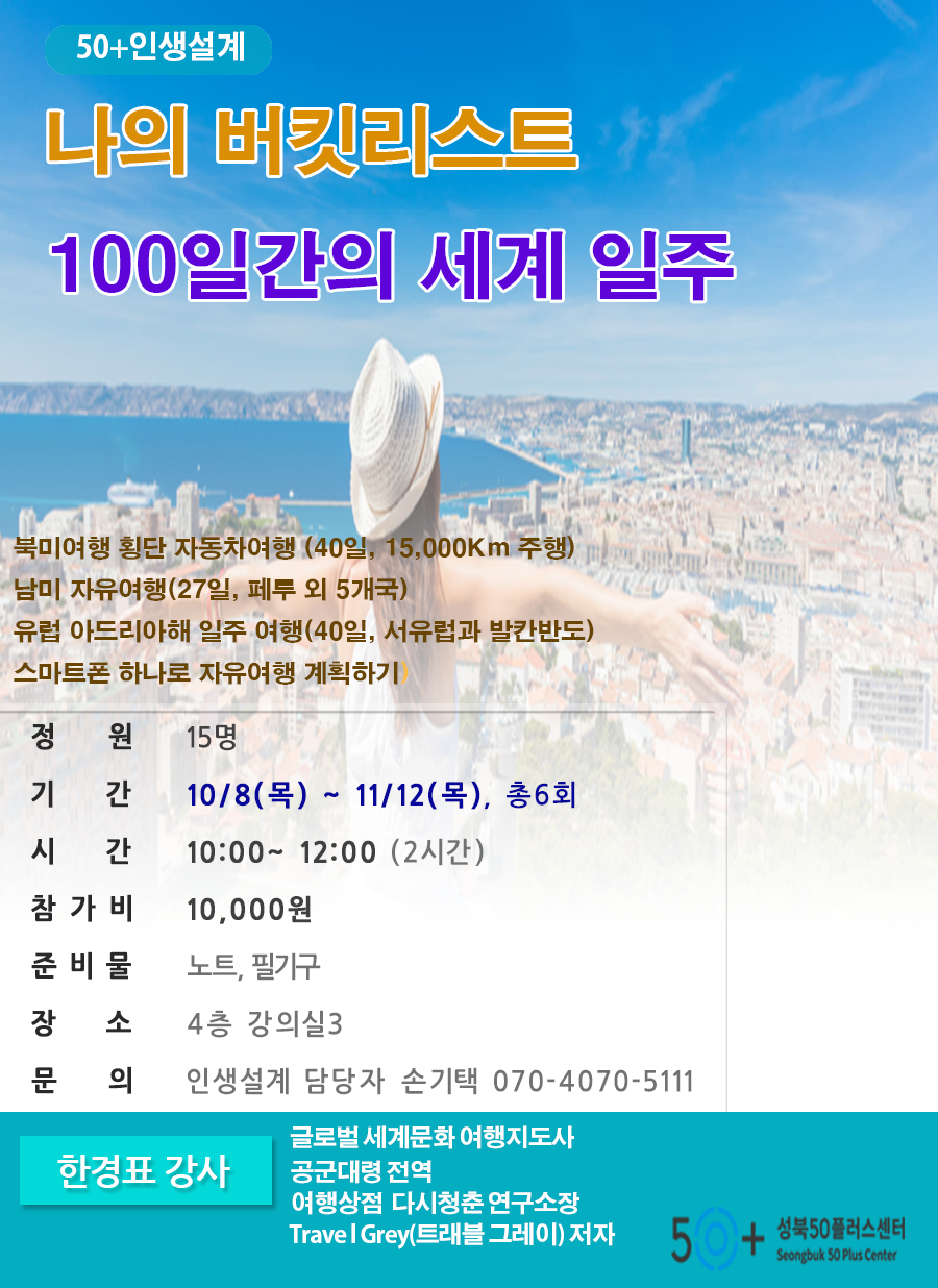 한경표 | -강사의 다양한 해외 자유여행 경험을 바탕으로 50+세대의 여행 의미와 여행을 통해서 얻은행복한 삶에 관한 이야기(인문학 맛보기) 50+ 여행 버킷리스트 작성하기 : 당신은 가슴 뛰는 버킷리스트를 가졌는가? 지금 당신에게 자장 소중한 것은 무엇인가? |