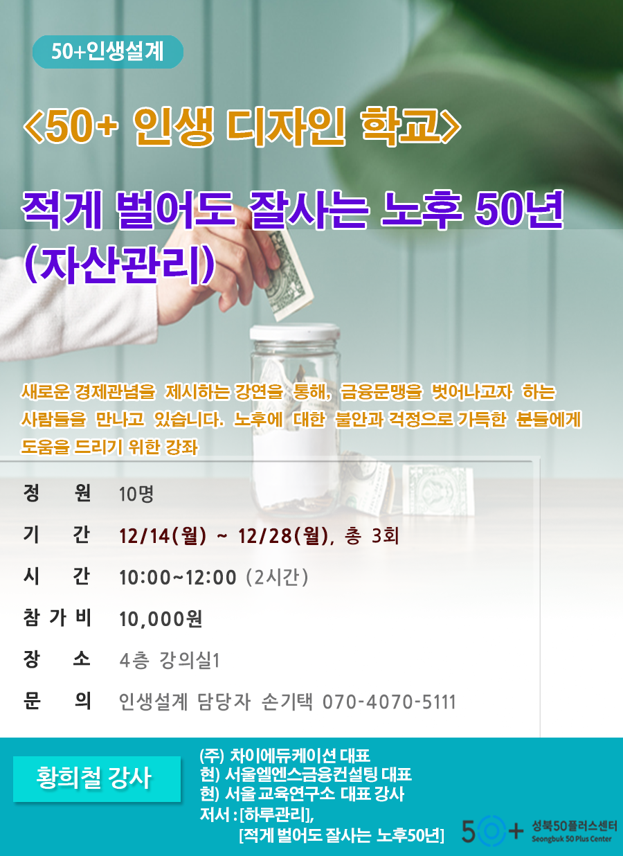 4층 강의실3 | 황희철 | 적게 벌어도 잘사는 노후 50년 : 노후 파산이란? 경제적으로 안정된 노후 | 노트, 필기도구 |