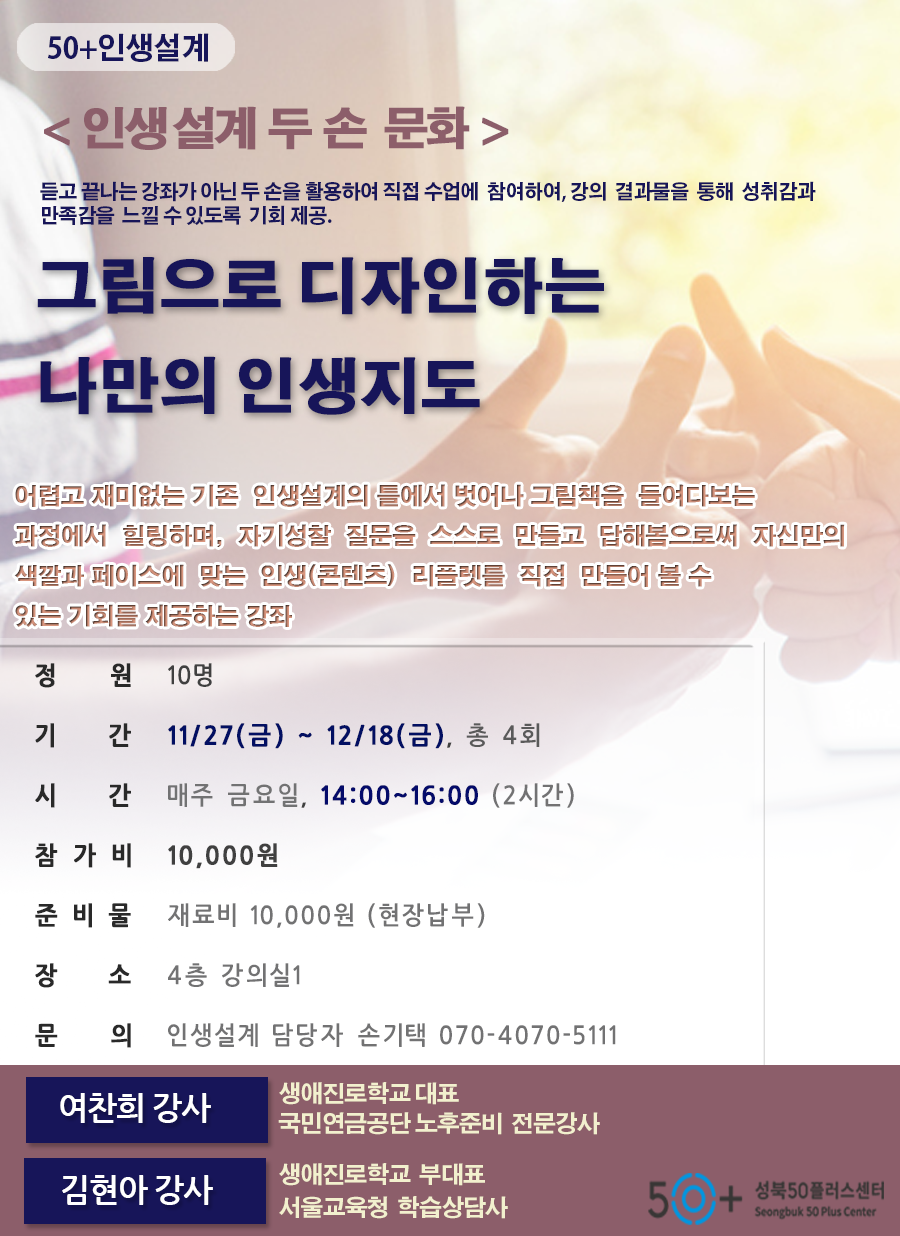 4층 강의실3 | 여찬희 | 그림책으로 하는 인생설계의 이해 : 의미와 재미가 공존하는 인생2막(‘나다움’ 의 이유와 조건) / 인생질문(Want, Like, Needs) | 노트, 필기도구 |