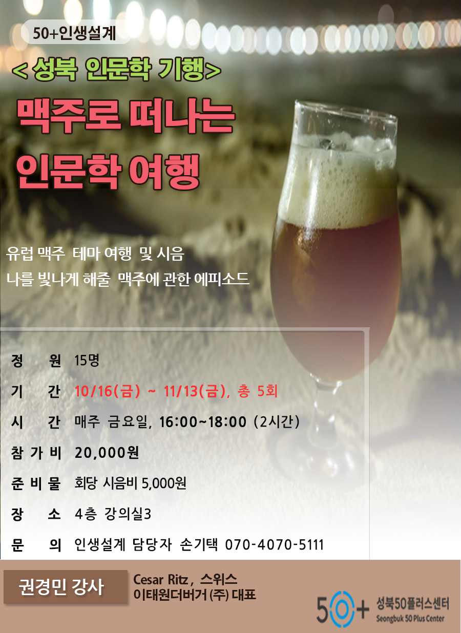 4층 강의실4 | 권경민 | 나라별 맥주로 떠나는 인문학 여행, 세계 맥주의 재밌는 이야기 | 노트, 필기도구, 회당 시음비 5,000원 |