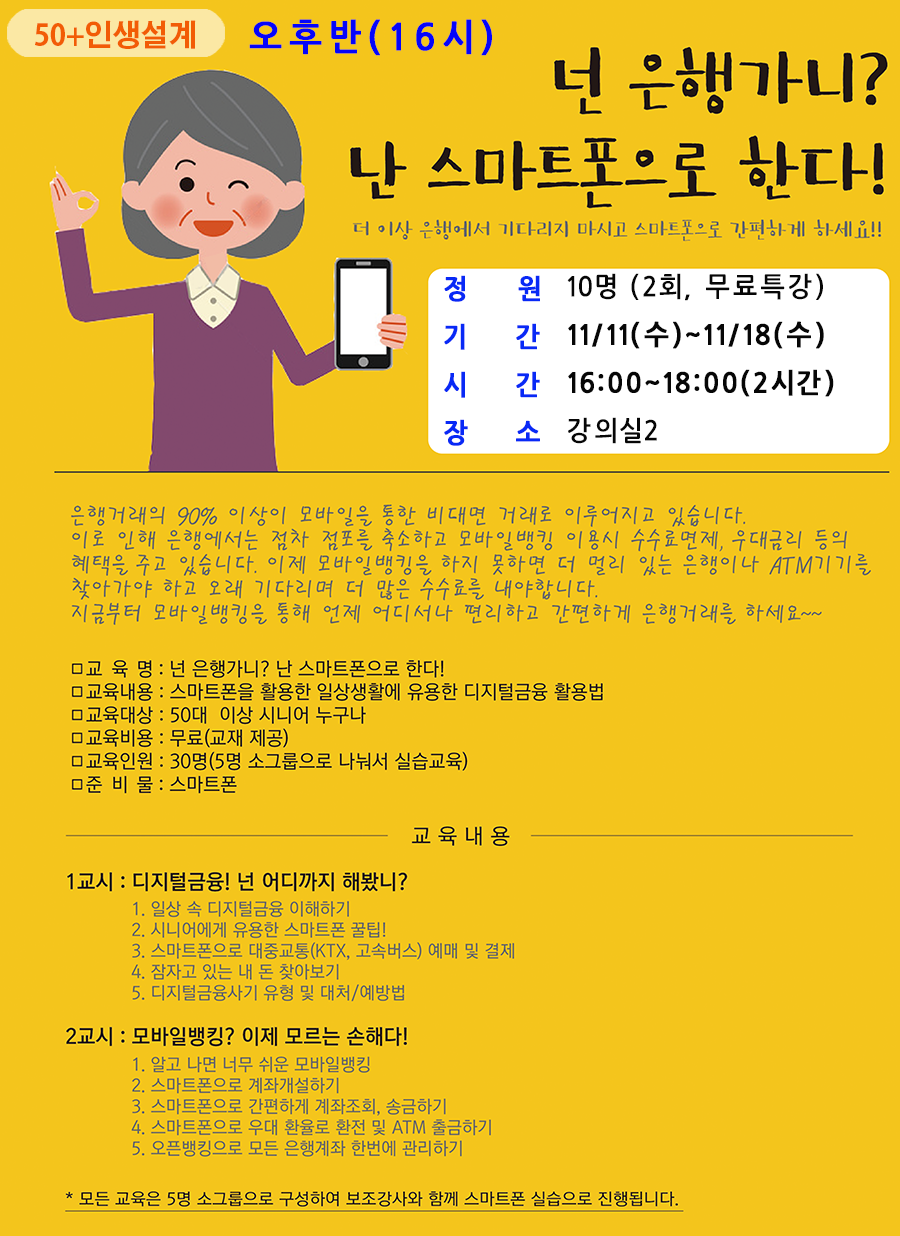 [인생설계-특강] 무엇이든 물어보세요? '스마트폰을 활용한 스마트한 금융관리' (11월11일 오후 16시)