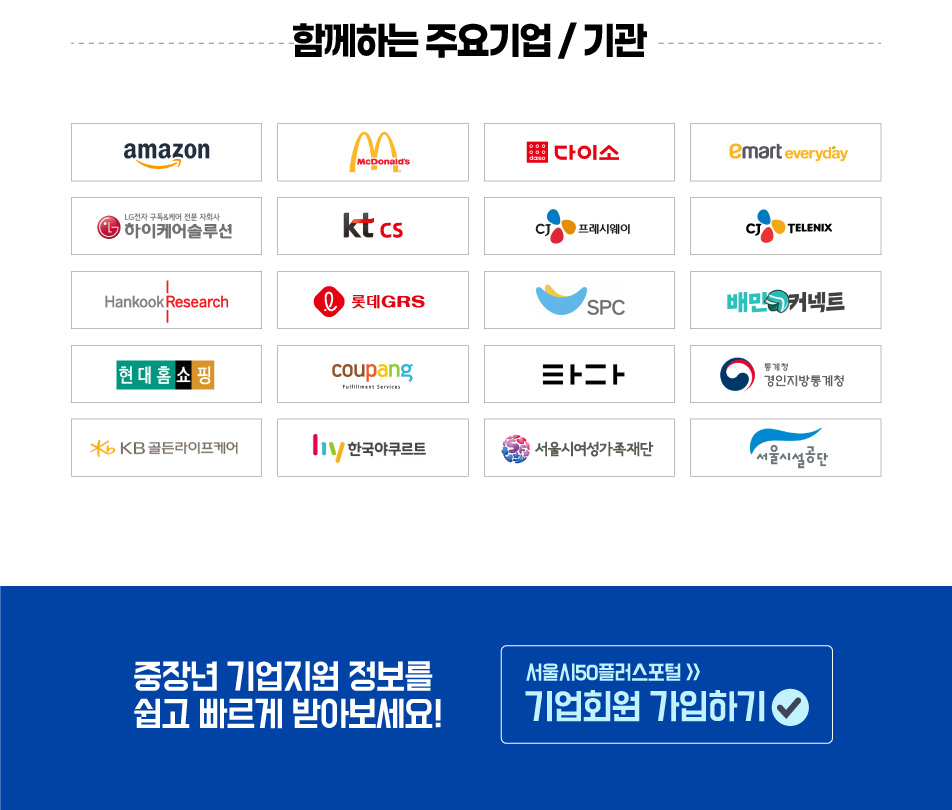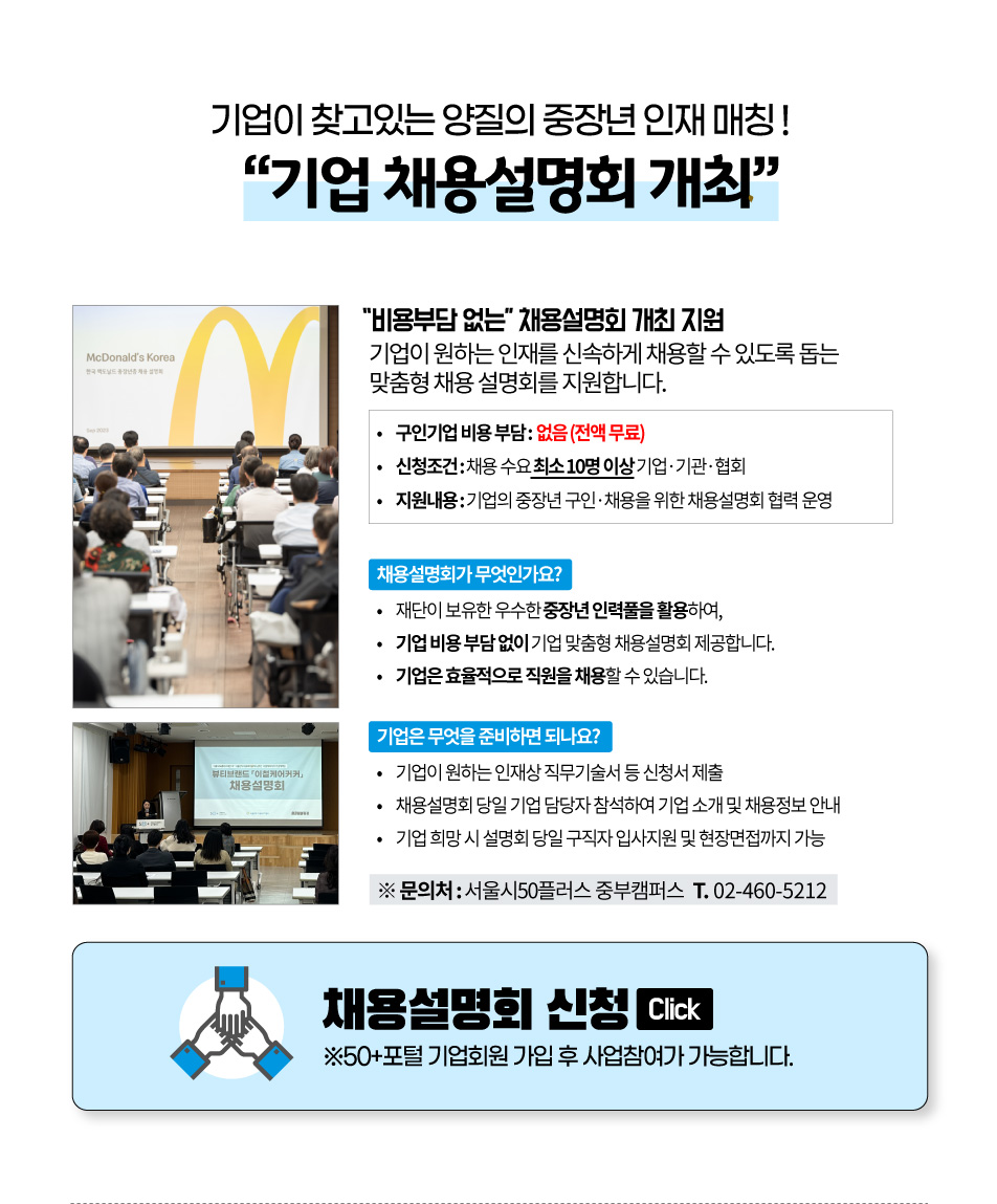 중장년을 필요로 하는 기업을 위해 맞춤형 지원사업을 운영합니다. 기업지원 핫라인 ☎️02-460-5201