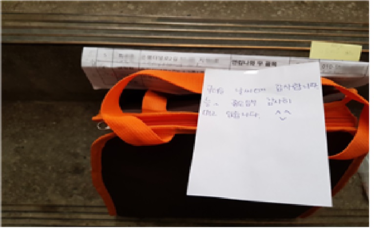 이렇게 현관문에 걸려있는 도시락을 볼 때면, ‘지원단이 단순 배송원인가’ 하는 생각이 들 수도 있다. 하지만 회수용 가방 안에서 감사의 쪽지를 발견하면 행복 전도사가 된 것처럼 사명감이 생기며 사회공헌을 한다는 뿌듯함과 보람을 느끼기도 한다.