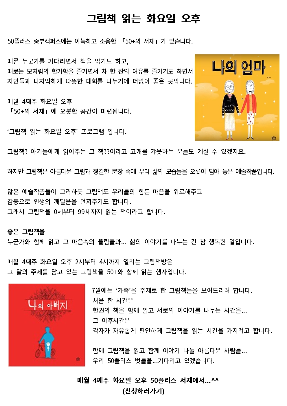 서울시50플러스 중부캠퍼스 (우04147)서울시 마포구 백범로31길 21, 서울복지타운 2층 사업자등록번호 : 232-82-00433