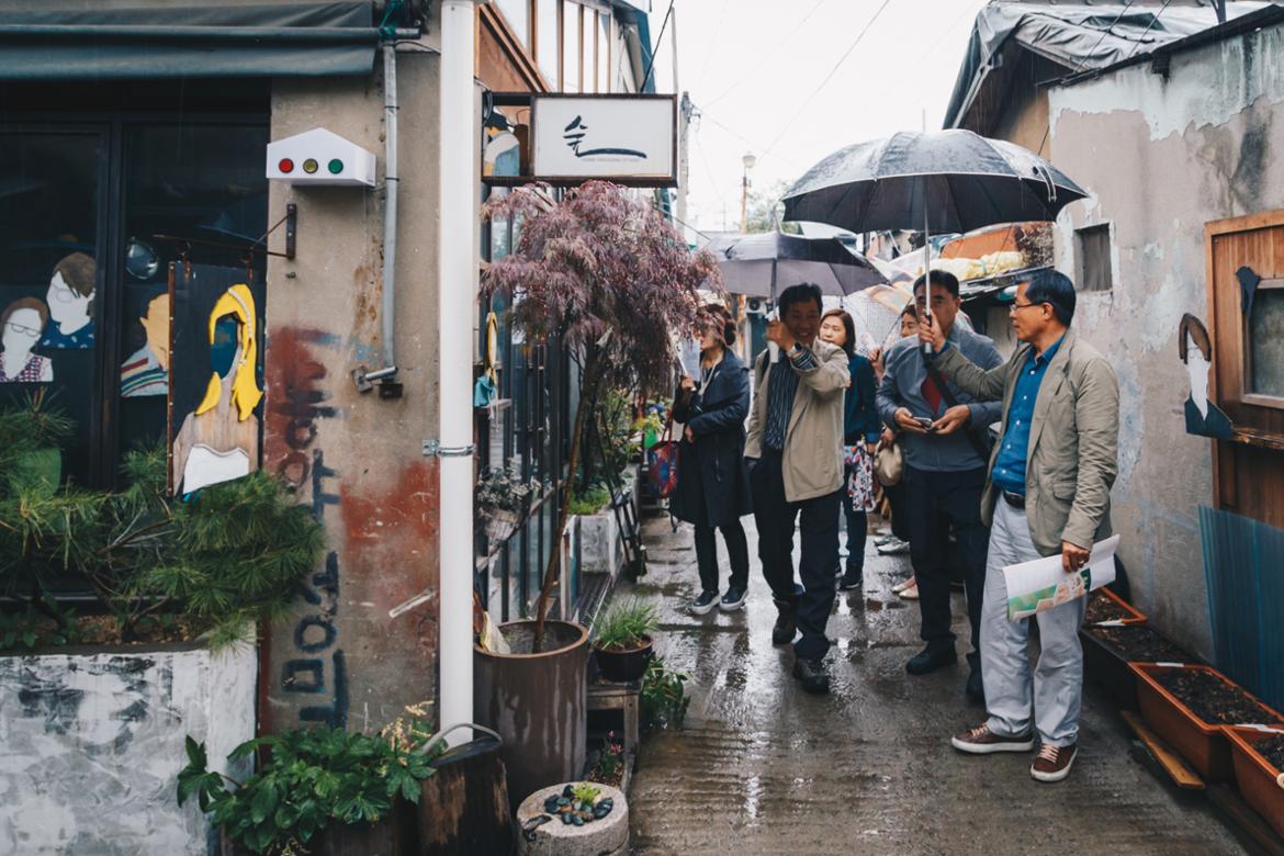 철강업이 번성하던 때 만들어진 오랜 철공소에서 들리는 쇠 깍는 소리를 음악 삼아 골목을 걸었다. 뒷골목 구석을 차지하고 있는 반전 있는 공간이 사람들의 눈길을 잡아챈다. 문래도시텃밭, 개성 뿜는 갤러리와 카페, 게스트하우스. 작가들의 작업장, 장인의 위엄이 느껴지는 철공소 등이 오묘한 조화를 이룬다. 골목길에서 마주하는 표지판과 그림 등을 발견하는 일도 제법 재미있다. 비 오는 날임에도, 커피 한잔이 아쉬워 들어간 곳곳의 카페에는 빈 자리가 없을 정도로 사람들로 넘쳐난다. 제법 시간이 흐르고 탐사에 나섰던 50+인생학교 교육생들께서 다락방이 있는 마을카페 ‘수다’로 속속 모여든다.