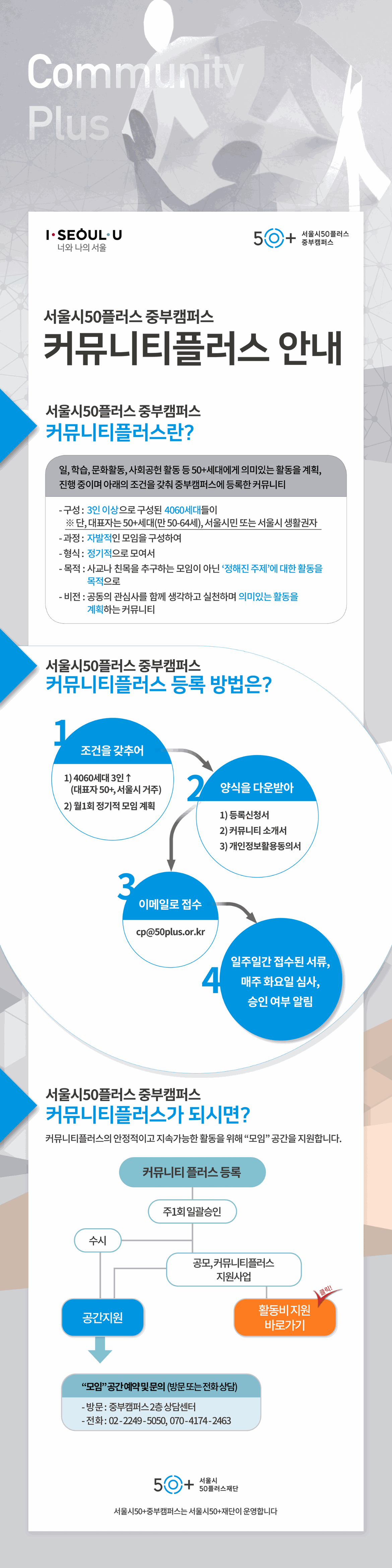 서울시50플러스 중부캠퍼스 (우04147)서울시 마포구 백범로31길 21, 서울복지타운 2층 사업자등록번호 : 232-82-00433