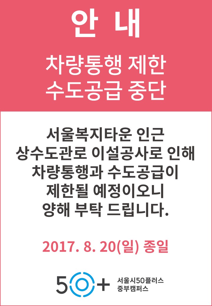 서울시50플러스 중부캠퍼스 (우04147)서울시 마포구 백범로31길 21, 서울복지타운 2층 사업자등록번호 : 232-82-00433