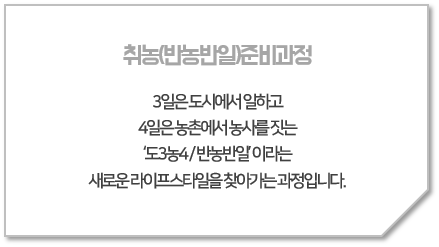 [취농(반농반일)준비과정]은 3일은 도시에서 일하고 4일은 농촌에서 농사를 짓는 ‘도3농4/반농반일’이라는 새로운 라이프스타일을 찾아가는 과정입니다.