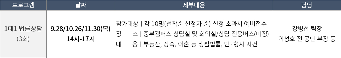 상담일에는 법률상담 전문가(2~4명)와 함께 1:1 법률상담을 받으실 수 있으며,