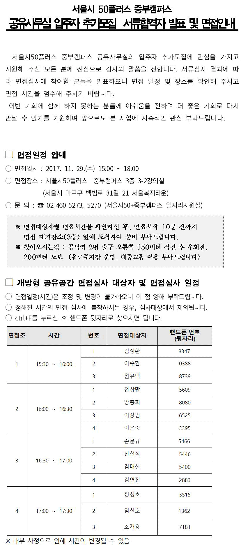 공유사무실 입주자 추가 모집 서류합격자 발표 및 면접안내