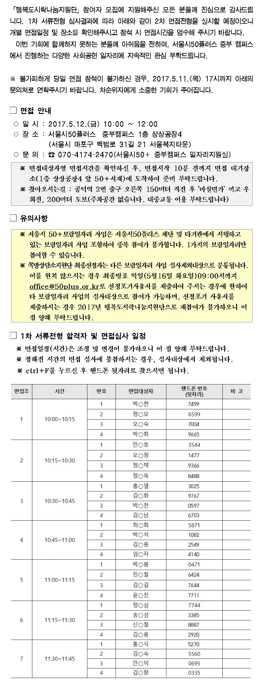 [중부보람일자리] 행복도시락 나눔지원단 서류합격자 발표 및 면접안내
