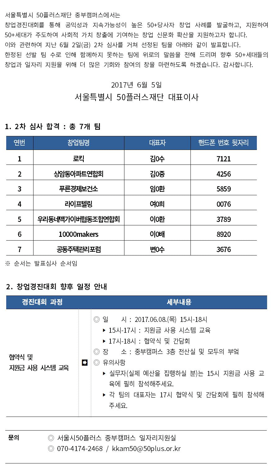 50+창업경진대회 2차 심사 합격팀 발표