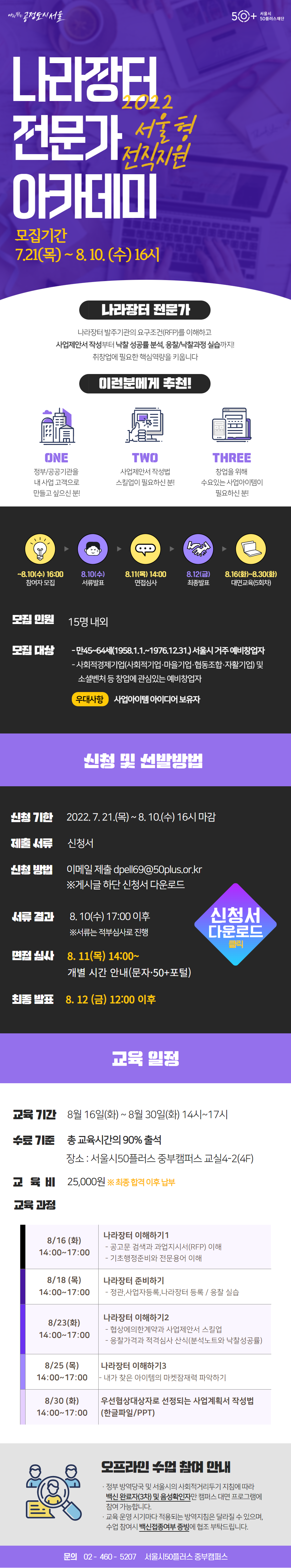 서울시50플러스 중부캠퍼스 (우04147)서울시 마포구 백범로31길 21, 서울복지타운 2층 사업자등록번호 : 232-82-00433