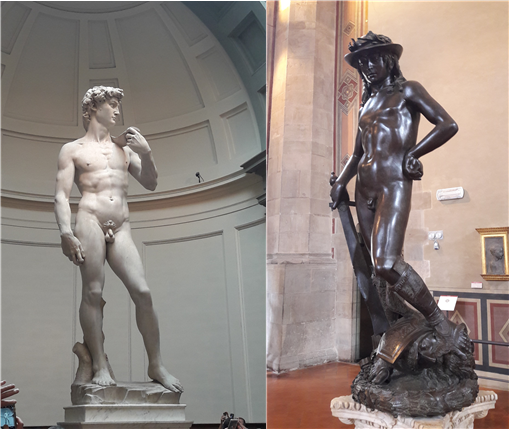 왼쪽: 미켈란 젤로의 대리석 다비드와 | 오른쪽: 도나텔로의 청동 다비드