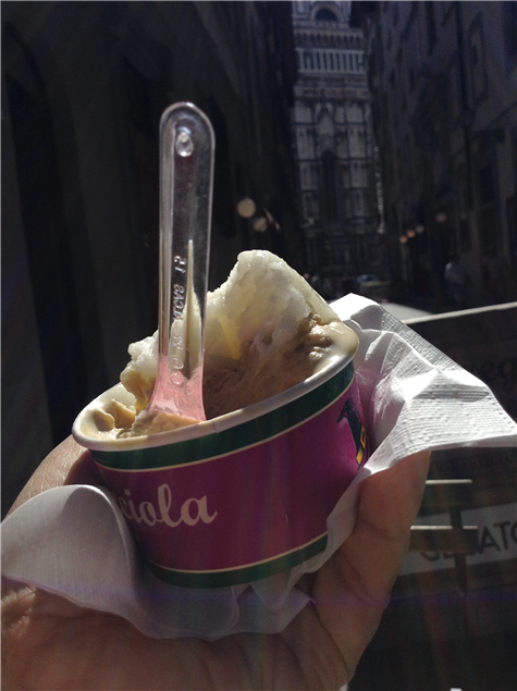 젤라또를 든 손 뒤로 두오모가 보인다.