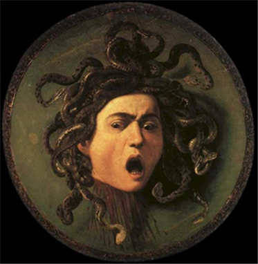 카라바조 작 - 메두사 (1596~1597): 캔버스 유화 목이 잘린 메두사의 공포와 절규가 느껴진다.