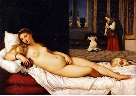 타치아노작 우르비노의 비너스: 유혹하는 자태가 눈에 띈다. 색감이 아름답다.
