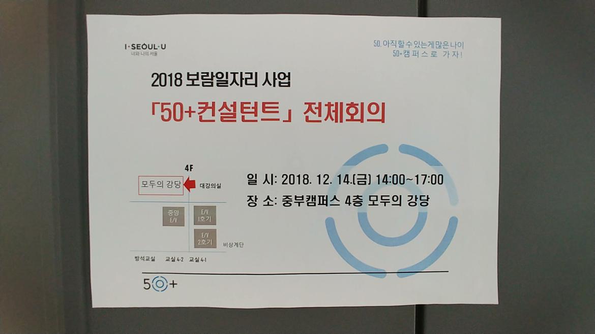 지난 12월 중순에 50+컨설턴트 전체모임이 중부캠퍼스 4층 모두의 강당에서 진행 되었다. 50+컨설턴트 사업단은 50+중부캠퍼스가 운영하는 보람일자리 핵심 사업으로 2018 마무리를 위한 자리였다. 총 67명의 컨설턴트가 한 해 동안 10번의 모임으로 밀접한 교류로 친분을 쌓아 왔다.